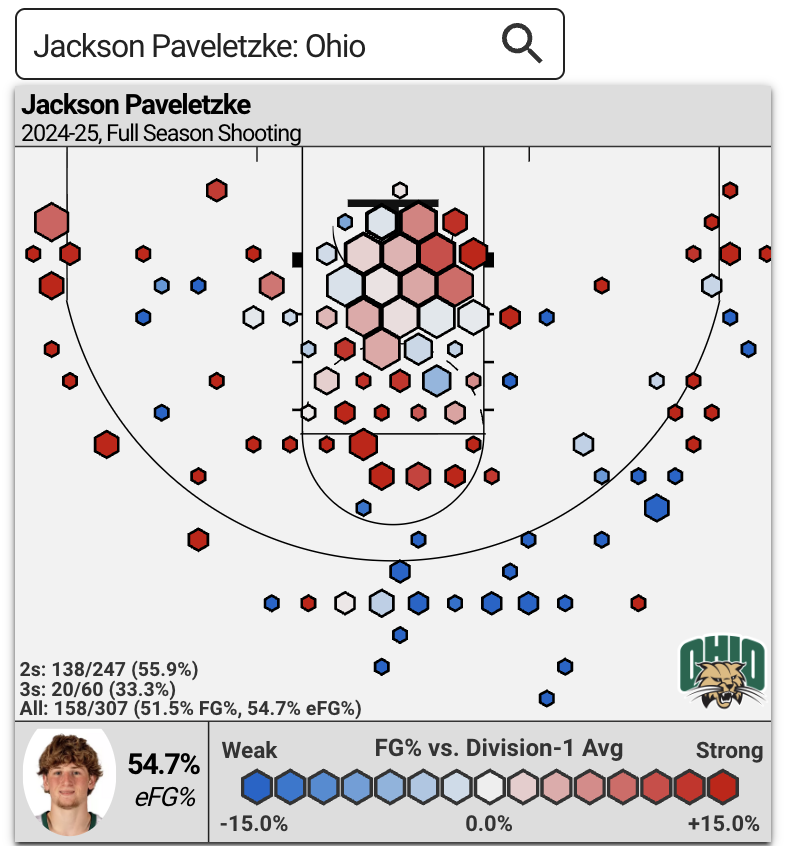 Average at the rim for CBB is around 53%. Bigs typically over 60% are considered good and guards over 45% are considered good.