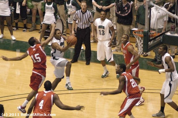 In a back-and-forth game with 12 lead changes, the Bobcats and RedHawks were even at the end of the first four periods, and a 50-32 rebounding disparity finally was too much for the Bobcats to overcome, even with turnovers in their favor, 20-11.