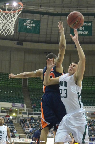 Four more turnovers in the first six minutes of the second half helped the Bobcats continue to put out their lead. Jon Smith scored on an offensive rebound and Offutt got a layup off of a steal for a 55-27 advantage.