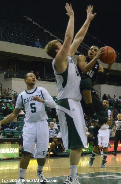 A Stevie Taylor basket and two Cooper free throws got the Bobcats within three and they were down just 19-15 after a Ricardo Johnson free throw at the 3:06 mark, but the Eagles ran off seven straight points, including five of them by Thompson. Taylor scored a layup to make it 27-17 at halftime.